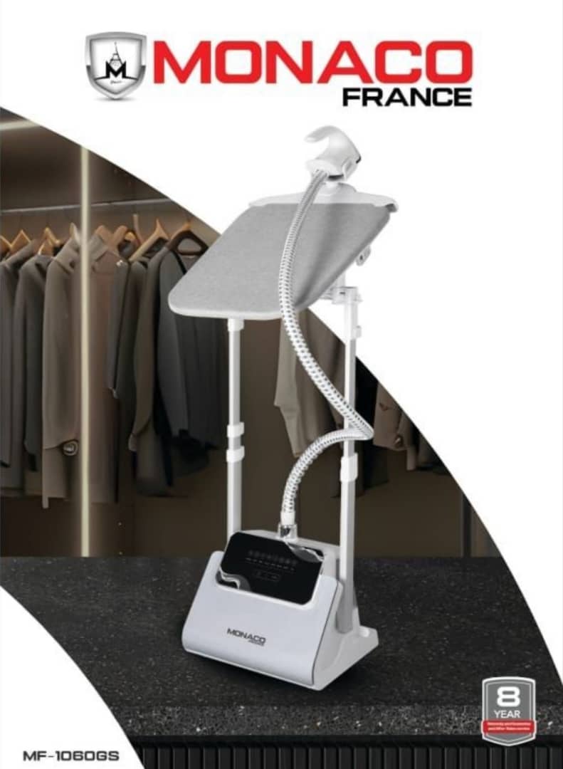 اتوبخار ایستاده موناکو مدل 1060 فرانسه با توان 2600 وات، بخاردهی 42 گرم در دقیقه، صفحهنمایش دیجیتال، 8 برنامه برای انواع پارچه و مخزن بزرگ 2.5 لیتری. مناسب برای اتوکشی حرفهای و سریع.
