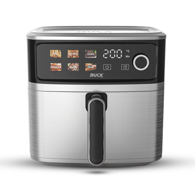 سرخکن بدون روغن باک مدل BK1020 با ظرفیت 9.4 لیتر، توان 2200 وات، بدنه استیل ضدزنگ و نمایشگر لمسی دیجیتال.