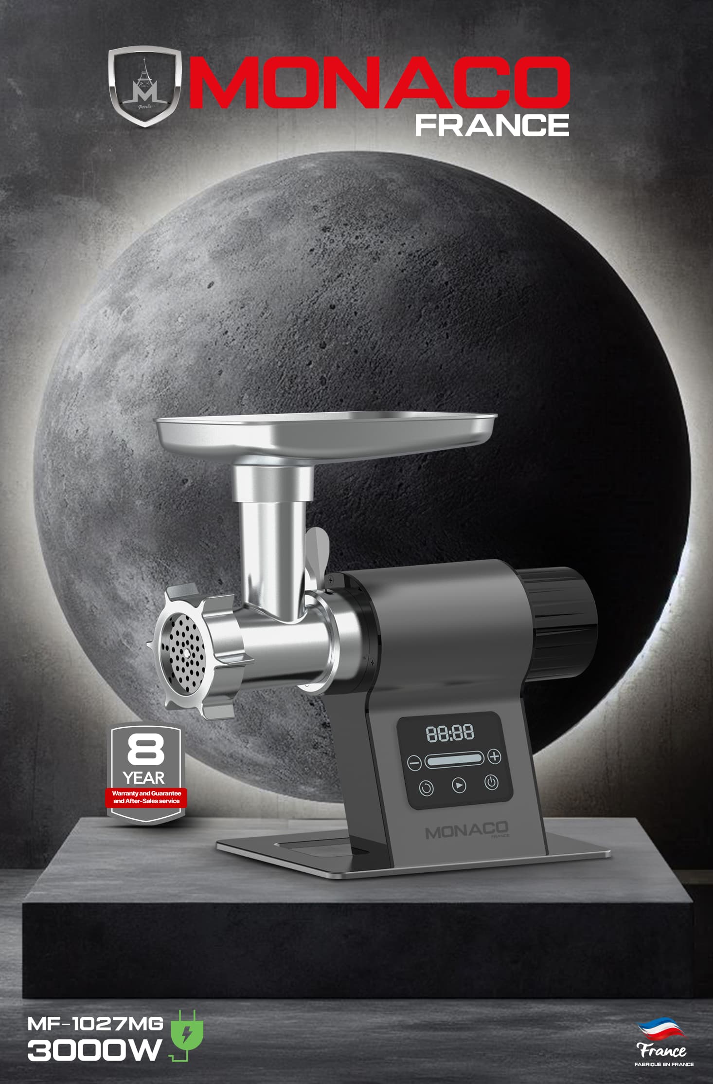 چرخ گوشت موناکو مدل 1027فرانسهmonaco 3000 وات با دیسک استیل، سوسیسساز، موتور AC، نمایشگر لمسی و عملکرد معکوس. مناسب آشپزی حرفهای و خانگی.